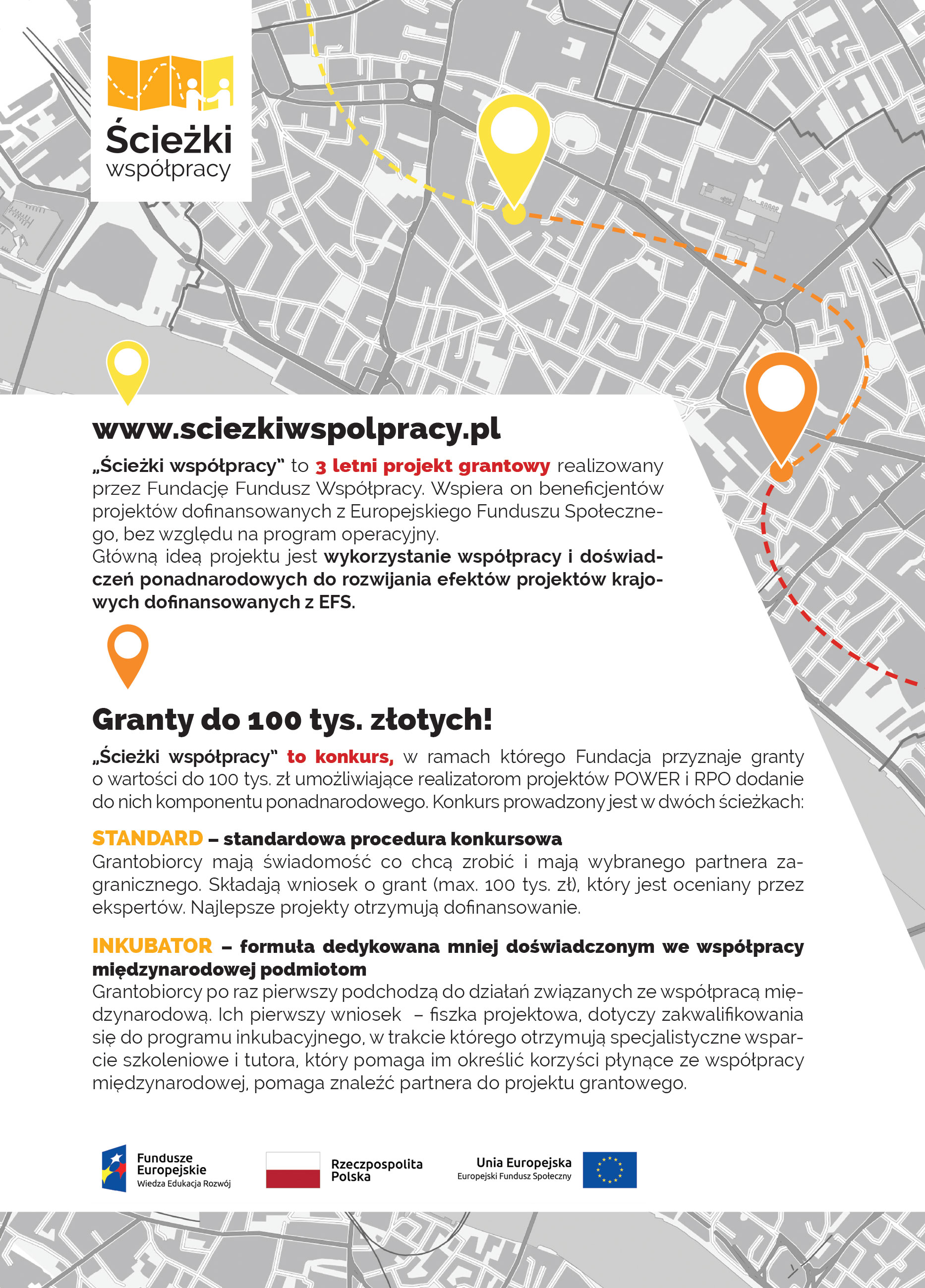 W lutym 2019 roku wystartuje pierwszy konkurs grantowy w ramach projektu POWER „Ścieżki współpracy – wsparcie dla podmiotów wdrażających współpracę międzynarodową” realizowanego przez Fundację Fundusz Współpracy. „Ścieżki…” otwierają przed realizatorami projektów z EFS zupełnie nowe perspektywy. Pozwalają dodać do krajowego projektu standardowego komponent współpracy międzynarodowej, czyli rozszerzyć go o nowe działania, a co za tym idzie produkty i rezultaty, które powstaną we współpracy z partnerem z UE. Na ten cel można uzyskać grant w wysokości do 100 tys. zł. W efekcie, krajowe projekty mogą zyskać wartość dodaną, a podmioty je realizujące mogą nauczyć się współpracy międzynarodowej w warunkach projektu rozliczanego ryczałtowo, przy dostępnym na każdym etapie wsparciu ze strony grantodawcy. Na czym to wsparcie polega? Przede wszystkim w projekcie przewidziane są dwie ścieżki wnioskowania o grant.