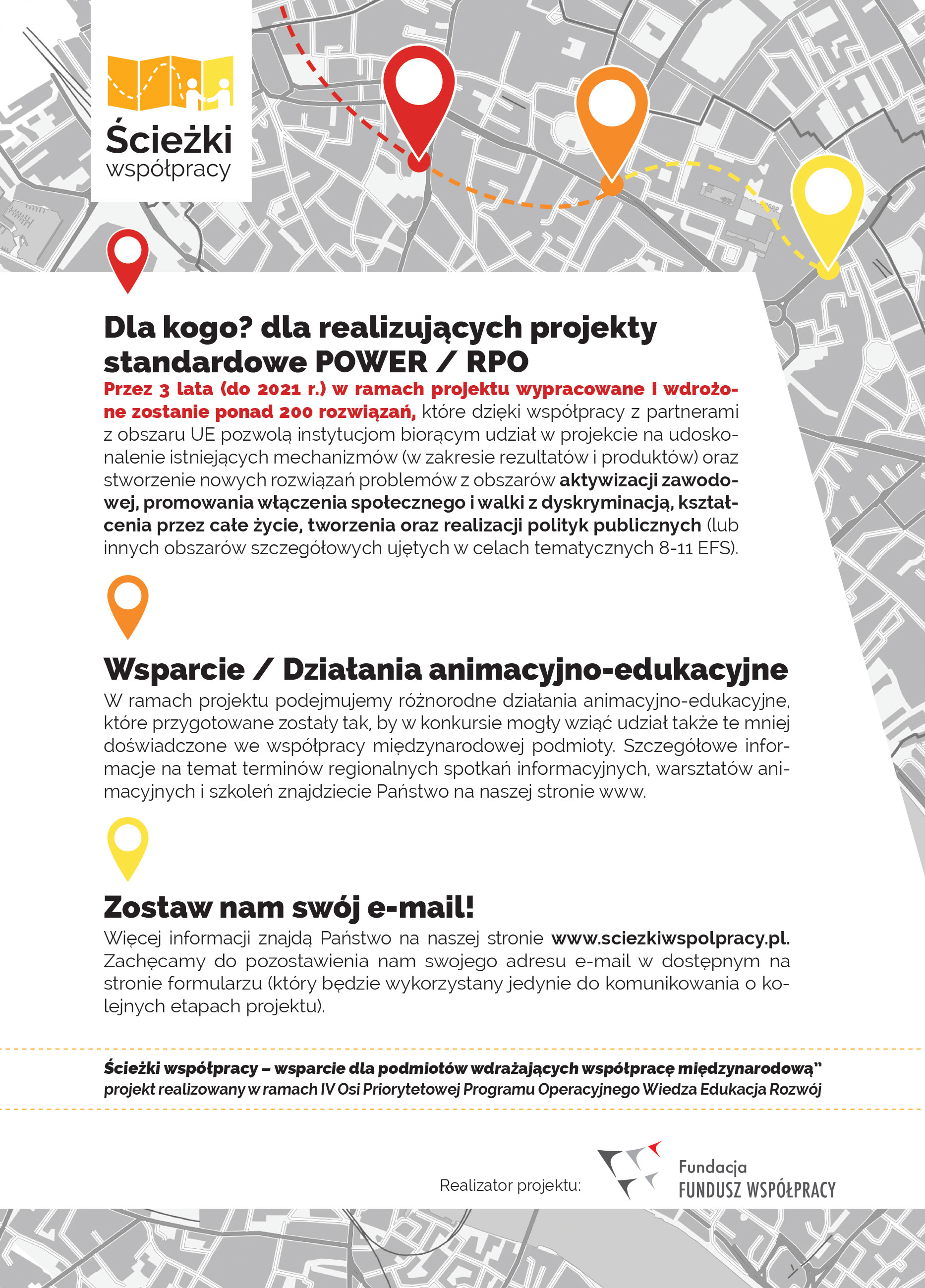 Na stronie internetowej – www.sciezkiwspolpracy.pl – opisane zostały wszystkie kluczowe kwestie związane z projektem, w tym dostępne ścieżki i rodzaje wsparcia. Zamieszczono również niezbędne dokumenty – regulamin konkursu, wzór wniosku i wzór umowy o grant, a także infografiki z wyjaśnieniem najważniejszych elementów konkursu grantowego oraz możliwych rodzajów współpracy międzynarodowej. Tam również znajdą się ogłoszenia o naborach oraz zapowiedzi spotkań informacyjnych i warsztatowych w całej Polsce.