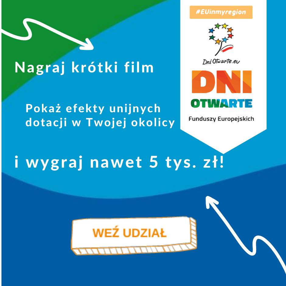 Fundusze Europejskie są bliżej niż myślisz! Rozejrzyj się, nagraj krótki filmik i pokaż nam, co zmieniło się w Twojej okolicy dzięki wsparciu ze środków unijnych. Możesz nam też opowiedzieć swoją historię o tym, co środki unijne zmieniły w Twoim życiu, pracy, nauce lub czasie wolnym.