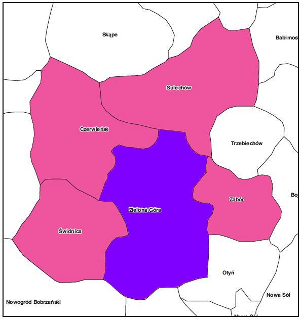 - Miejski Obszar Funkcjonalny dla Miasta Zielona Góra: Zielona Góra – rdzeń oraz Gminy: Czerwieńsk, Sulechów, Świdnica, Zabór.